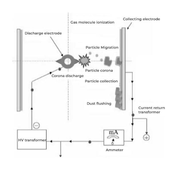 Elektrofiltr (ESP) to wysoce wydajne urządzenie służące do usuwania cząstek zawieszonych z przemysłowych gazów spalinowych. ESP działa na zasadzie przyciągania elektrostatycznego, w którym cząstki unoszące się w powietrzu są ładowane, a następnie gromadzone na uziemionej powierzchni, usuwając je z powietrza. Urządzenie składa się zwykle z dwóch kluczowych elementów: elektrody wyładowczej i elektrody kolektorowej. Kiedy do elektrody ulotowej zostanie przyłożony prąd stały o wysokim napięciu (DC), generowane jest silne pole elektryczne. Pole to jonizuje cząstki w powietrzu, powodując nabycie przez nie ładunku ujemnego. Ujemnie naładowane cząstki są następnie przyciągane do dodatnio uziemionego kolektora, gdzie są gromadzone i ostatecznie usuwane za pomocą kombinacji wibracji i metod mechanicznych.